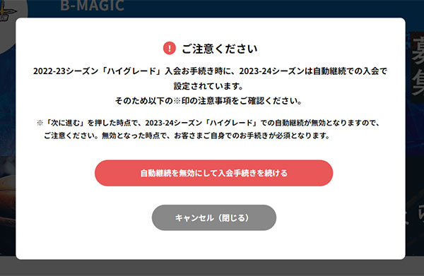 なお、2021-22SEASONから2022-23SEASONで自動継続にてご入会された方の場合は2023年6月30日までにご入会いただいた方には下記画面が表示されますので、そのままお進みください。