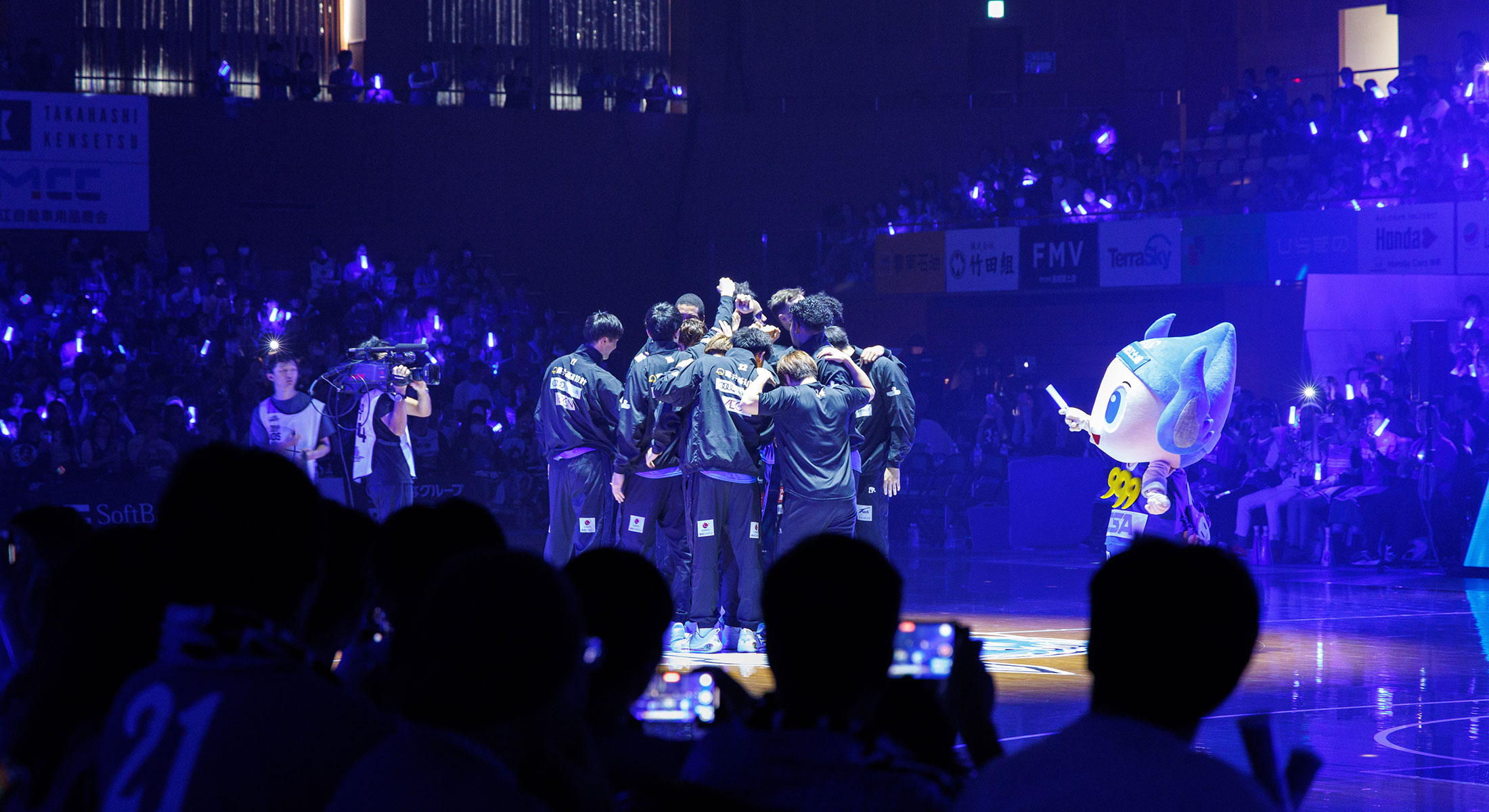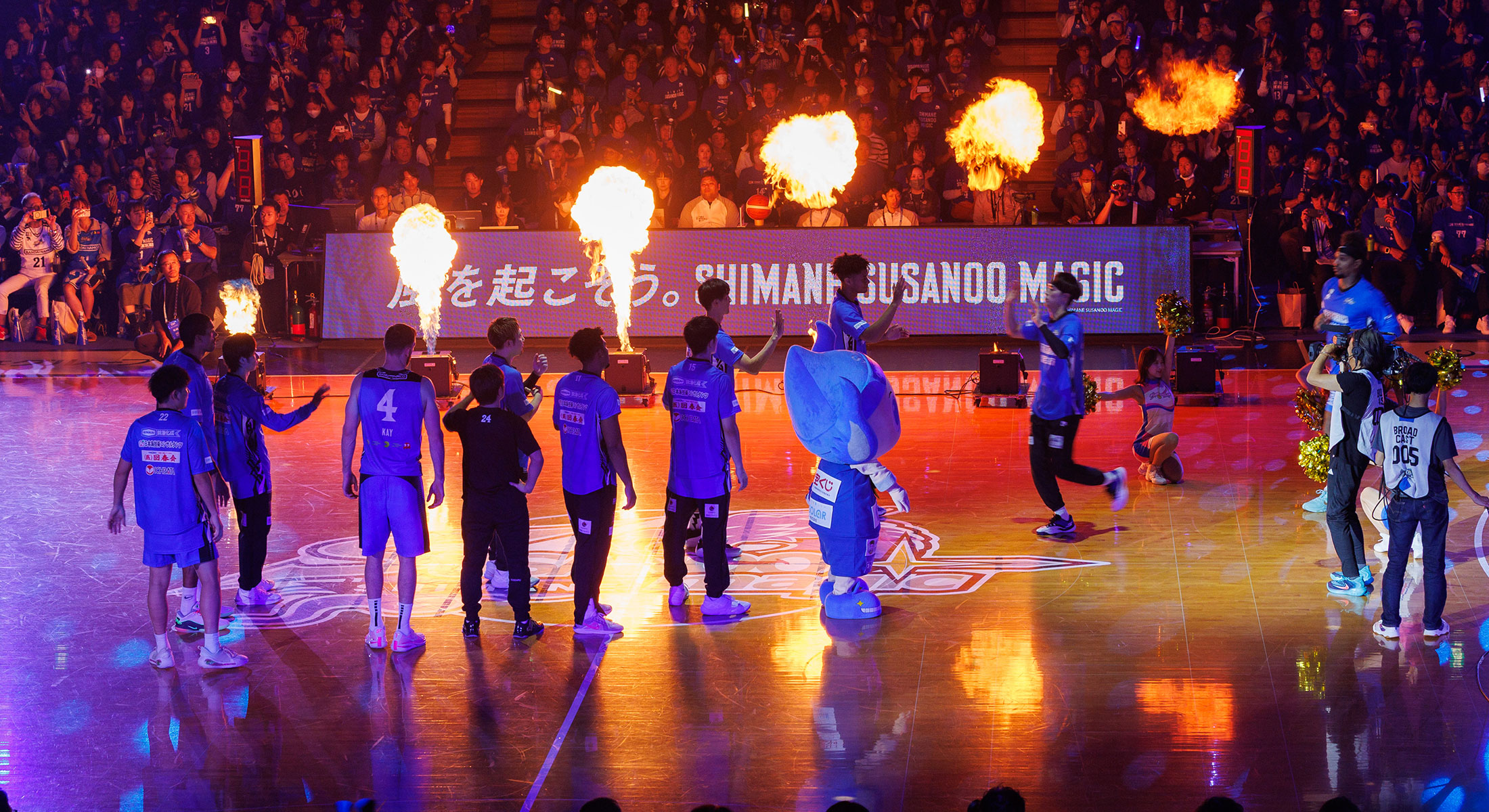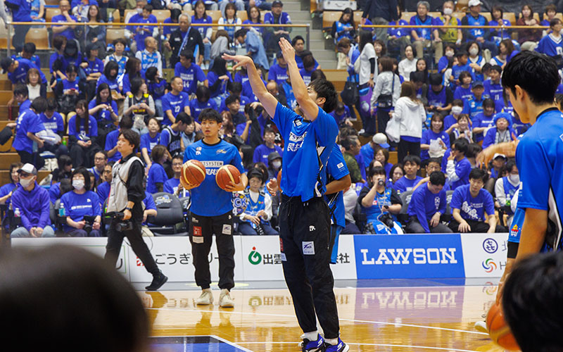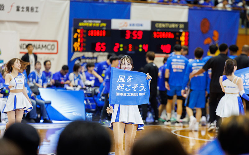TIP OFF1時間前から選手がコートへ入場し、ウォーミングアップスタート。各チームのメンバー発表に加えて、島根スサノオマジックのオフィシャルチアパフォーマンスグループ「アクア☆マジック」によるパフォーマンスが行われ、会場のボルテージが急上昇!