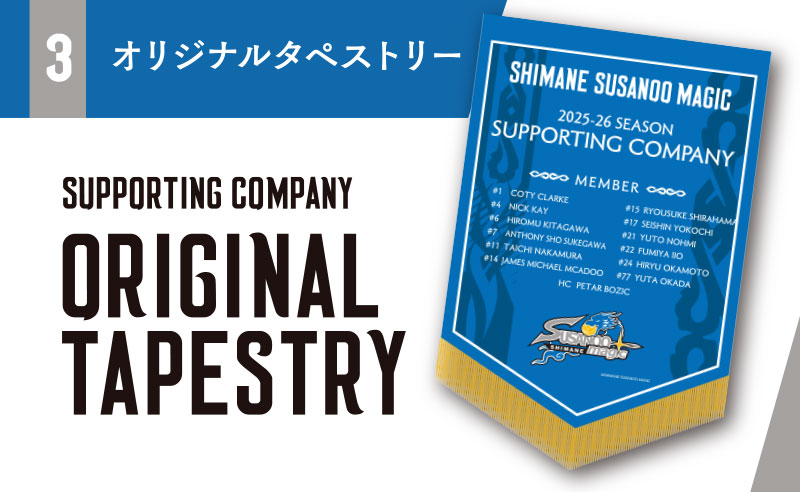 島根スサノオマジッククラブ公式WEBサイトのサポートカンパニー一覧ページに社名・団体名を掲載いたします。