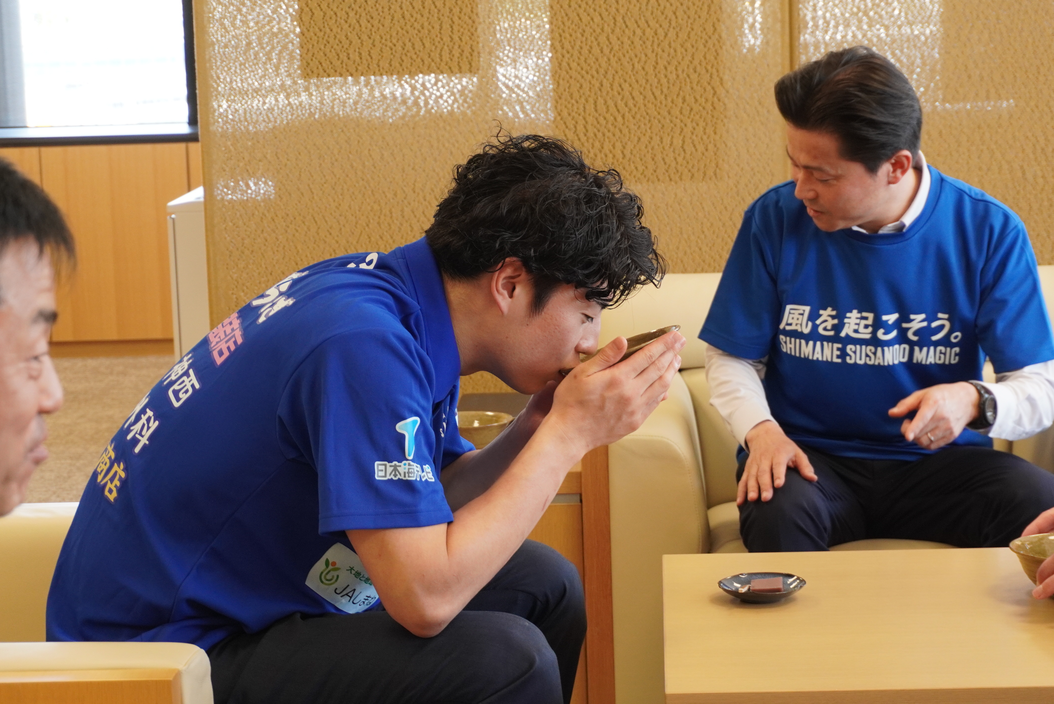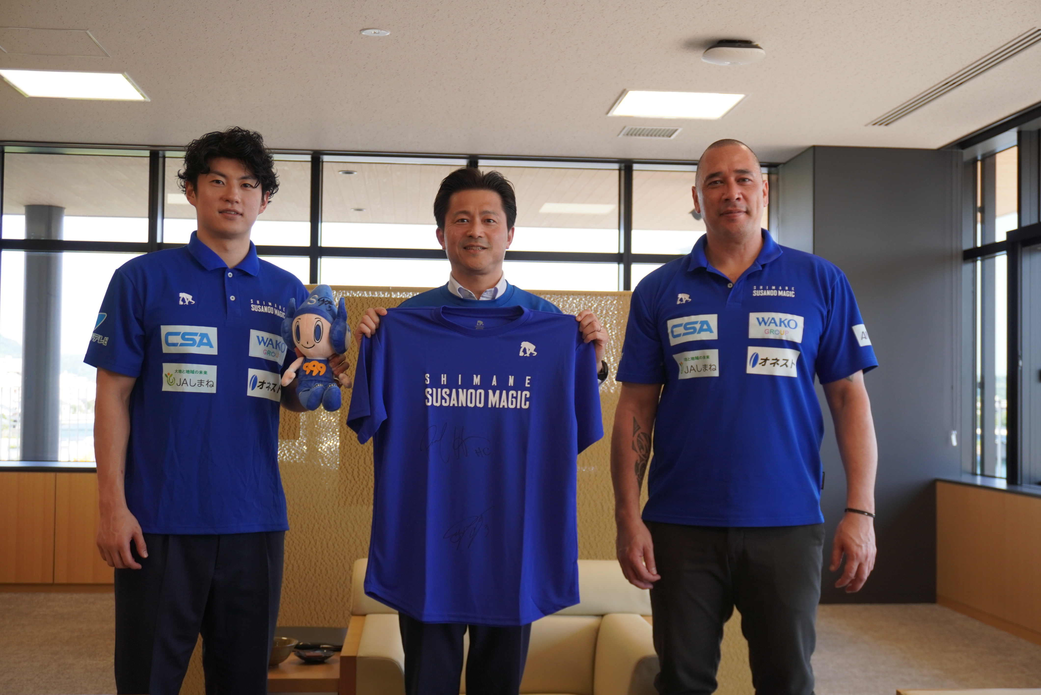 株式会社バンダイナムコ島根スサノオマジックからは、代表取締役COO 中村 律、ポール・ヘナレHC、キャプテンの安藤 誓哉 選手が訪問し、シーズン終了のご報告と御礼のご挨拶を行い、「サイン入りTシャツ」と「サイン入りすさたまくん」をお贈りさせていただきました。