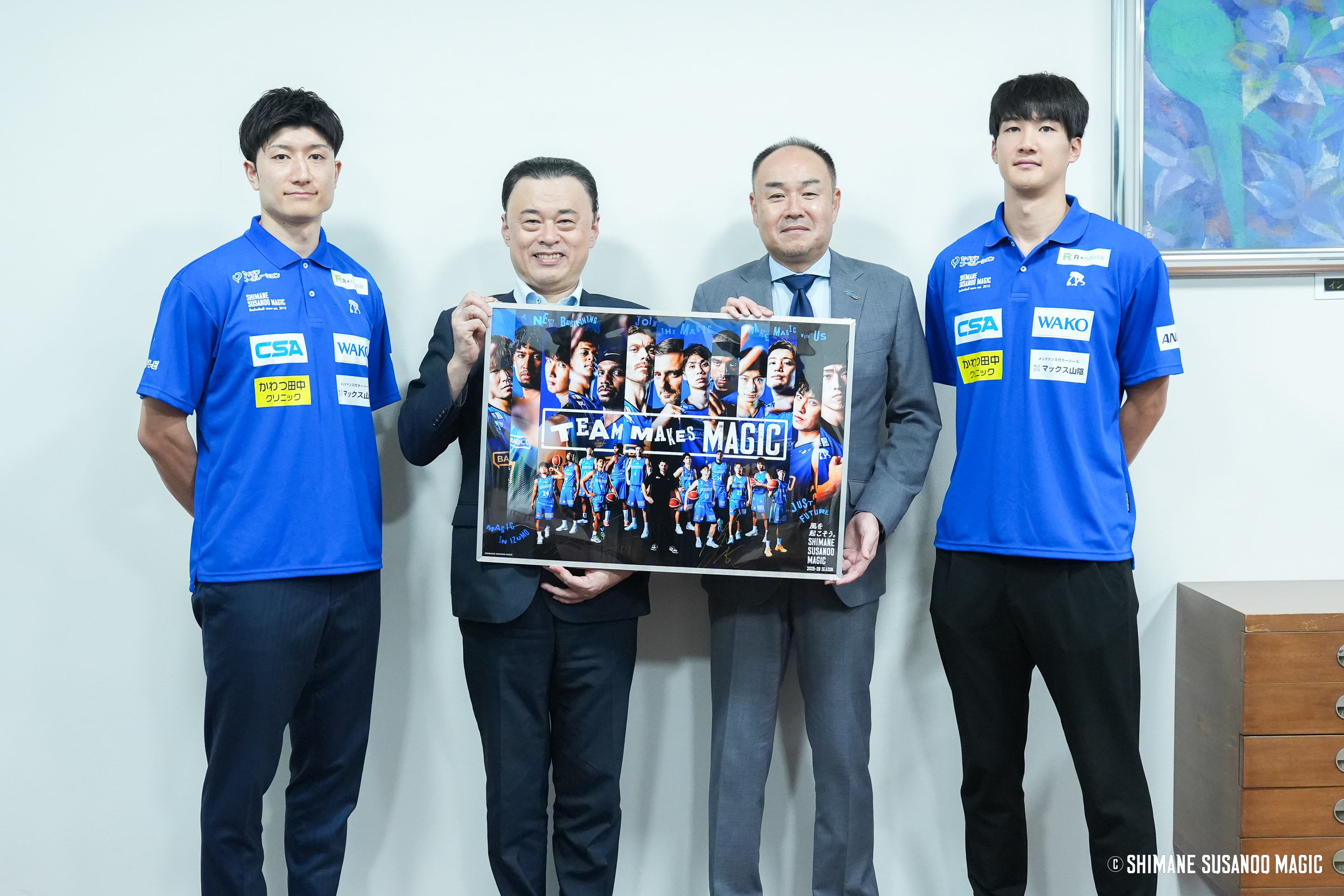 株式会社バンダイナムコ島根スサノオマジックからは、#11 中村 太地選手、#15 白濱 僚祐選手、代表取締役社長 榎本 幸司が訪問いたしました。