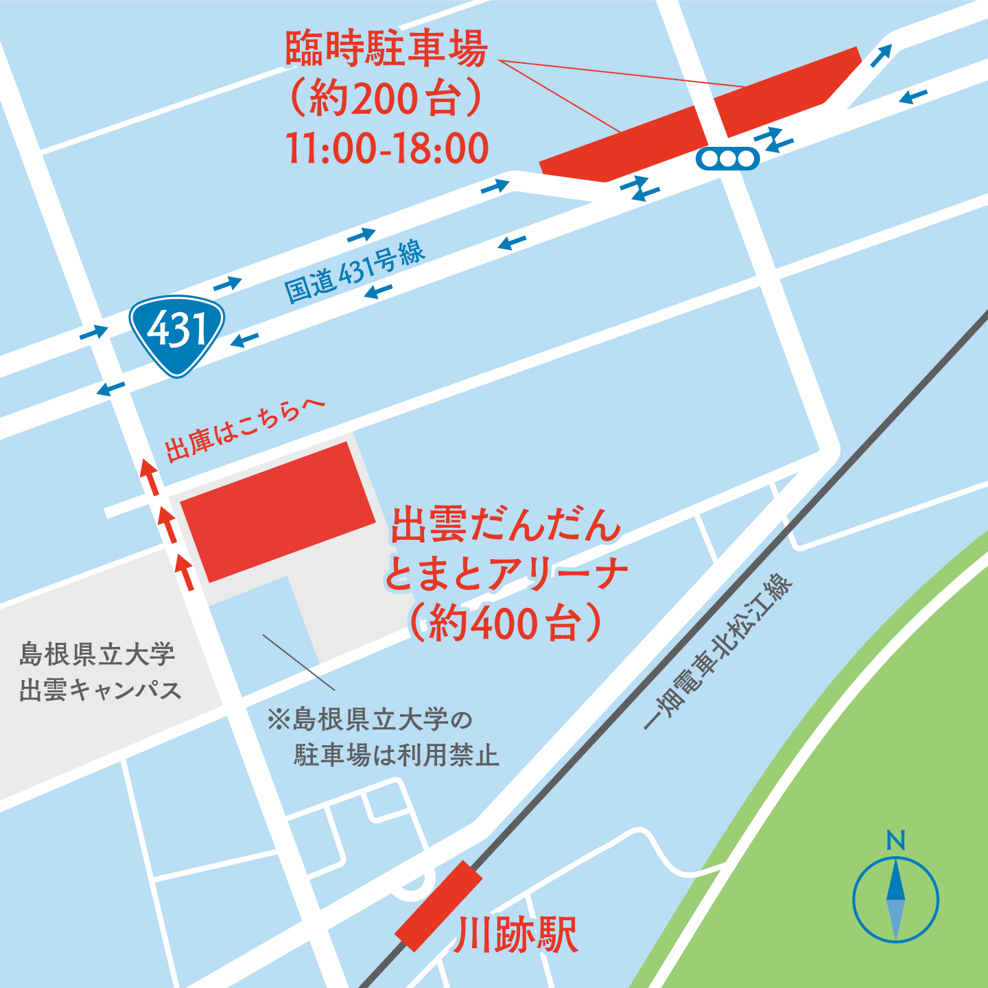 出雲だんだんとまとアリーナの駐車場に駐車できる台数に限りがあるため、会場から徒歩約10分程度の場所に、臨時駐車場を開設いたします。