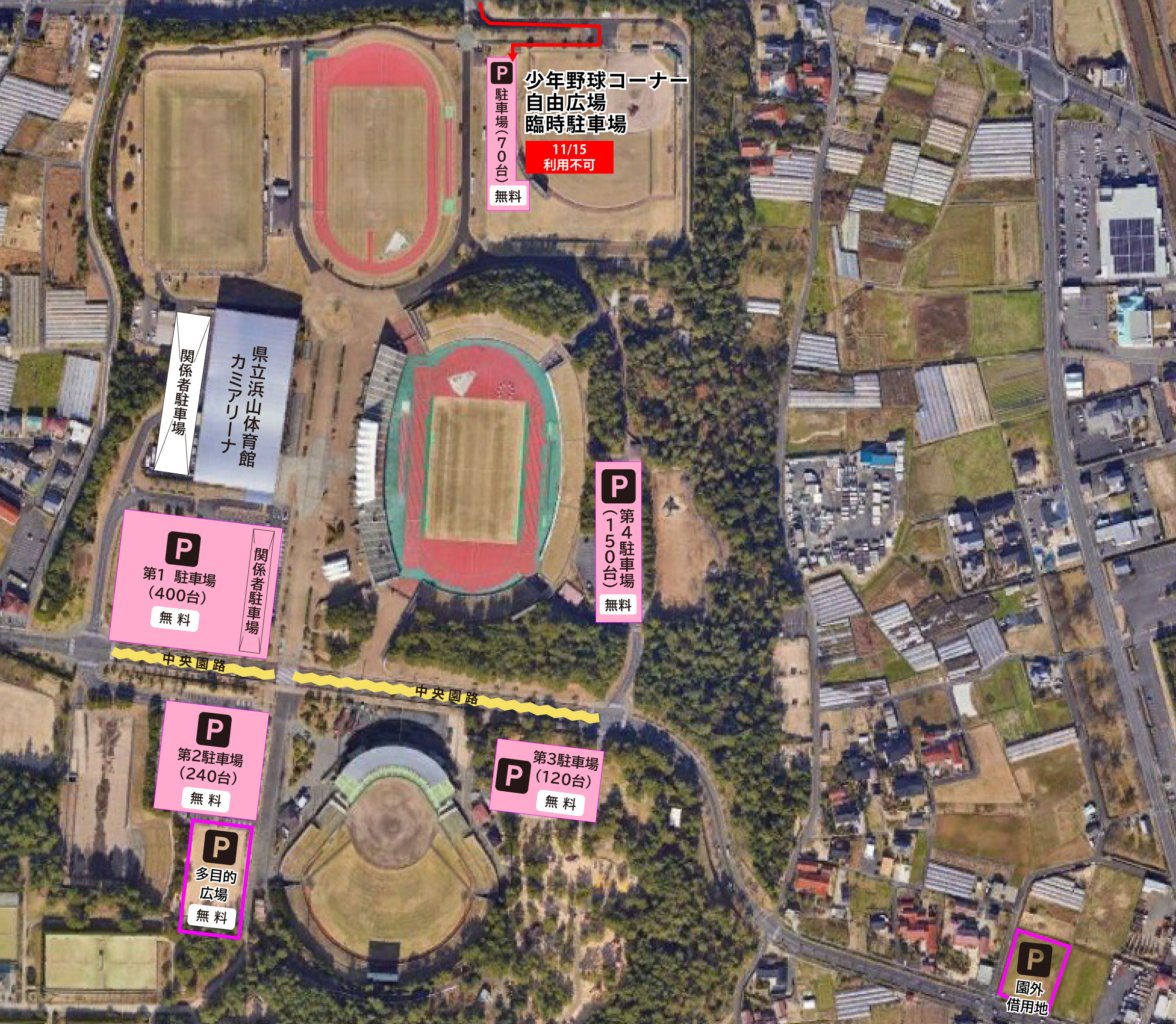 試合当日は浜山公園内各施設で他のイベントが開催されるため、浜山公園内駐車場については大変混雑が予想されます。