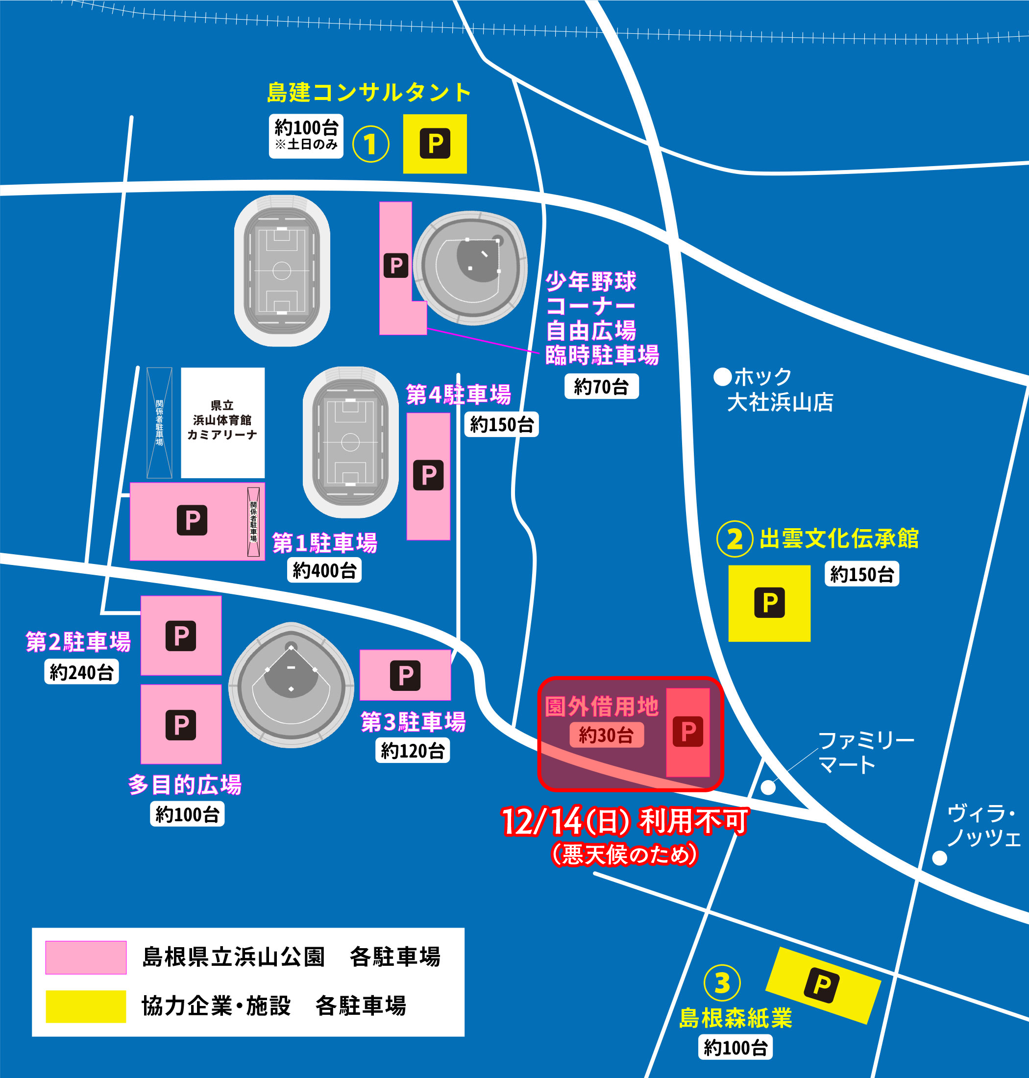 | 利用不可 | 島根県立浜山公園 臨時駐車場(園外借用地) | 約30台 |