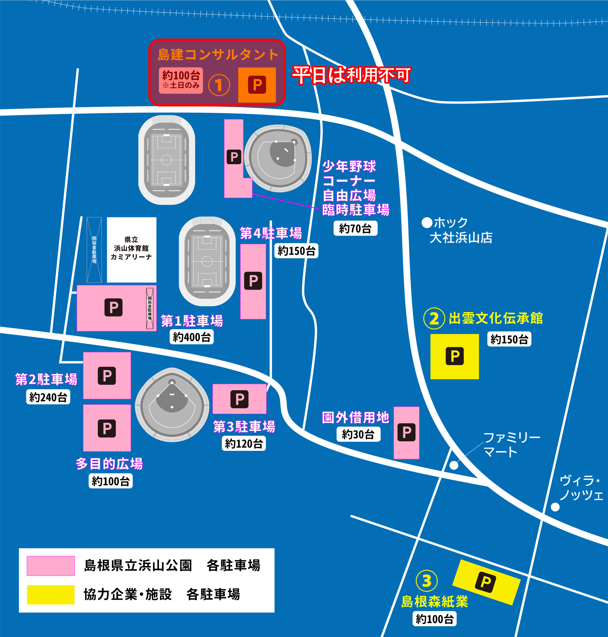 | 0% | 島根県立浜山公園 臨時駐車場 (少年野球コーナー横自由広場) | 約70台 |